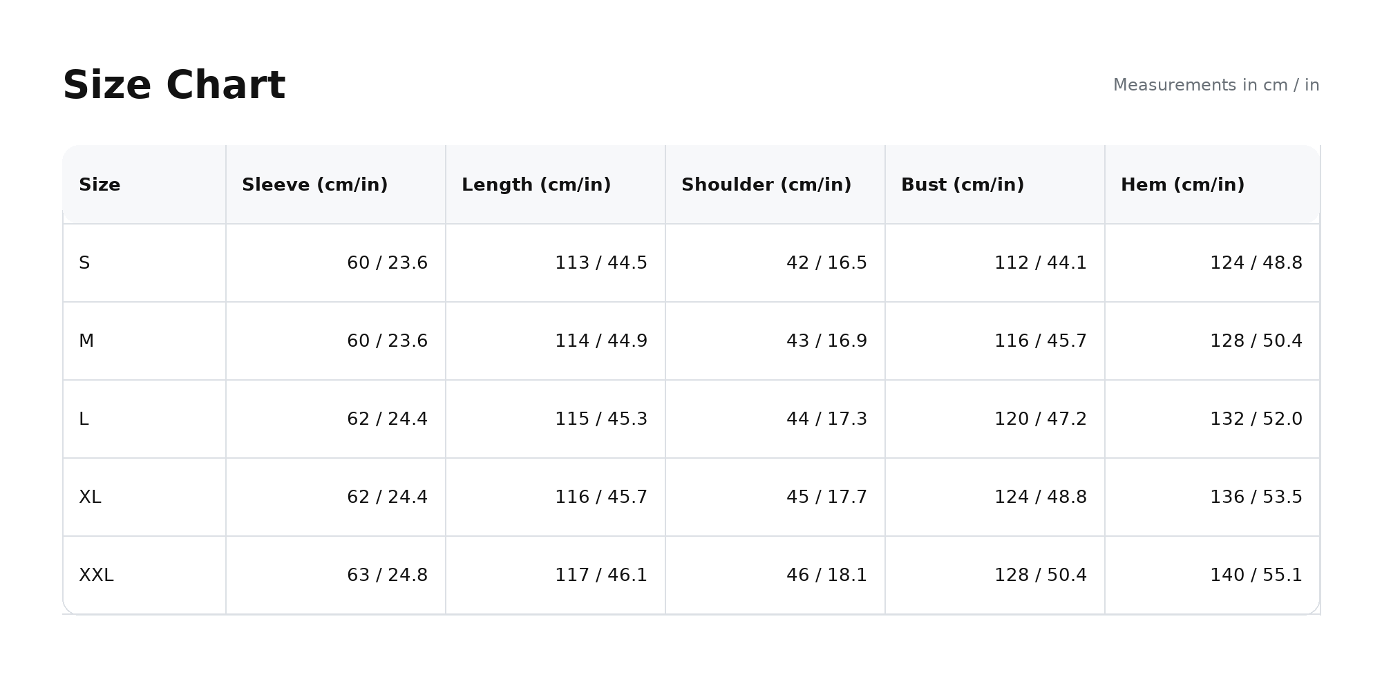 If you prefer an oversized, relaxed look, we recommend sizing up one or two sizes.