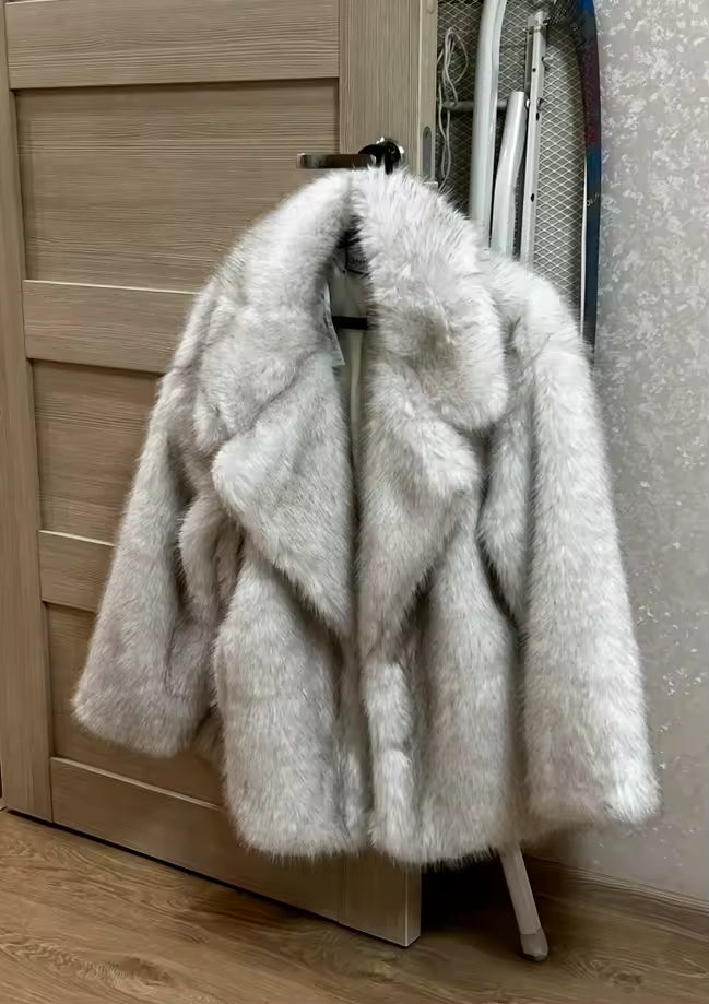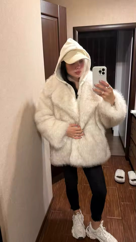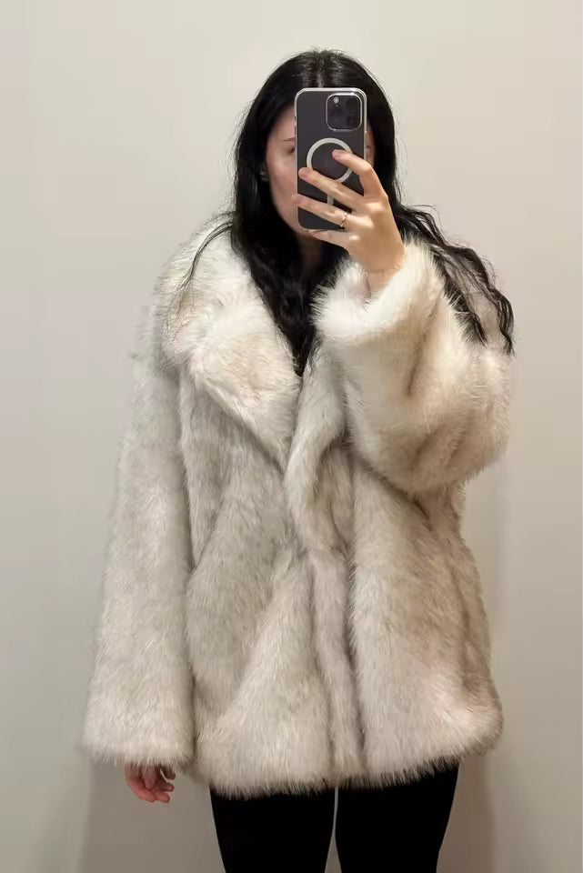 Elara is your oversized winter cloud. In frosted ivory faux-fur that pools around you, she makes even a hoodie and leggings feel like a look while keeping you cocoon-level warm. It’s the coat that turns every doorway, sidewalk and airport terminal into your soft-focus moment.