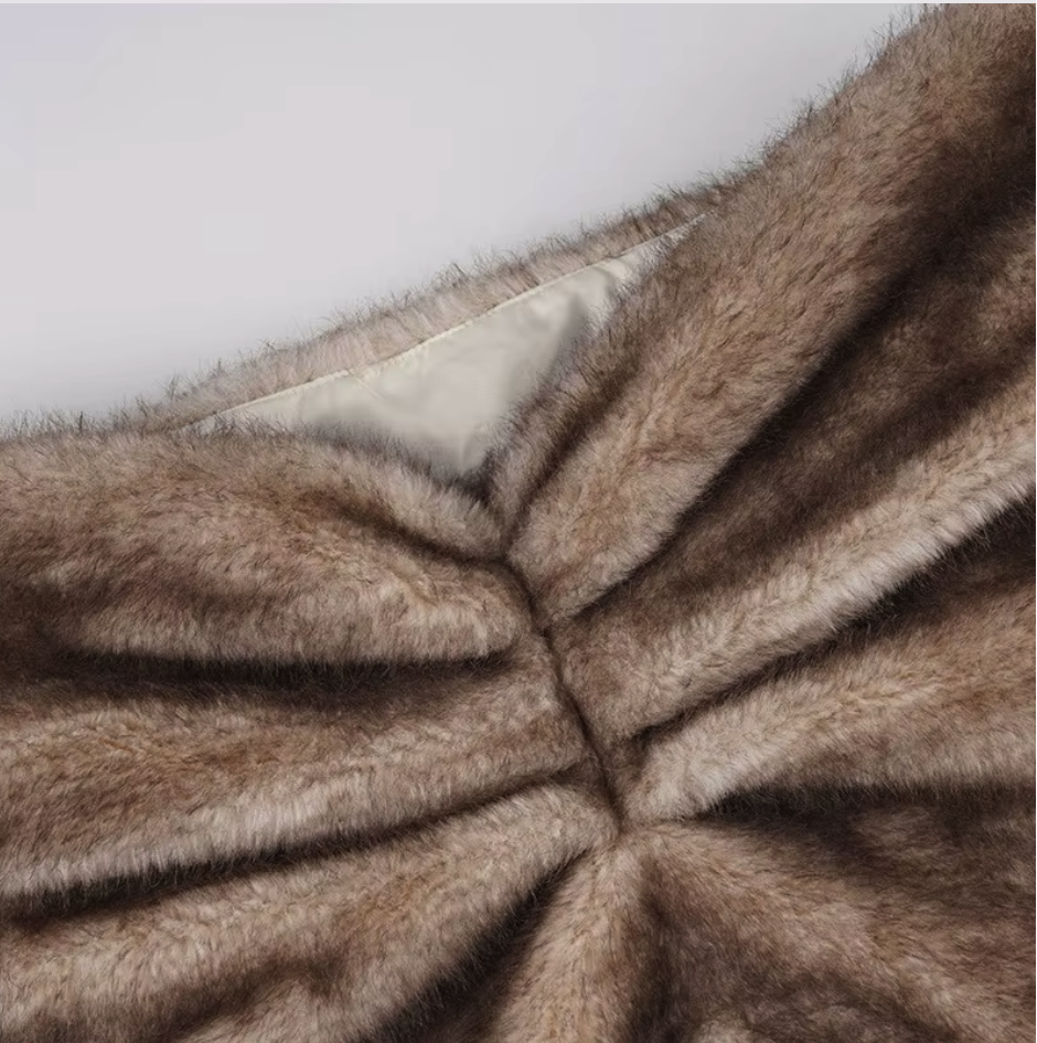 Naya is pure main-character après-ski-in-the-city energy. The sculpted wrap front and plush faux-fur finish frame your hips like a spotlight, turning a simple black top into a full look in seconds. She’s the mini you wear for late-night plans, rooftop dinners, and “I didn’t try” confidence and when someone asks if it’s real fur, you get to smile and say: completely fur-free.