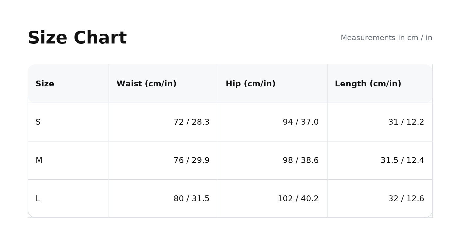 - Length – Measure from the top edge of the waistband straight down to the bottom hem.