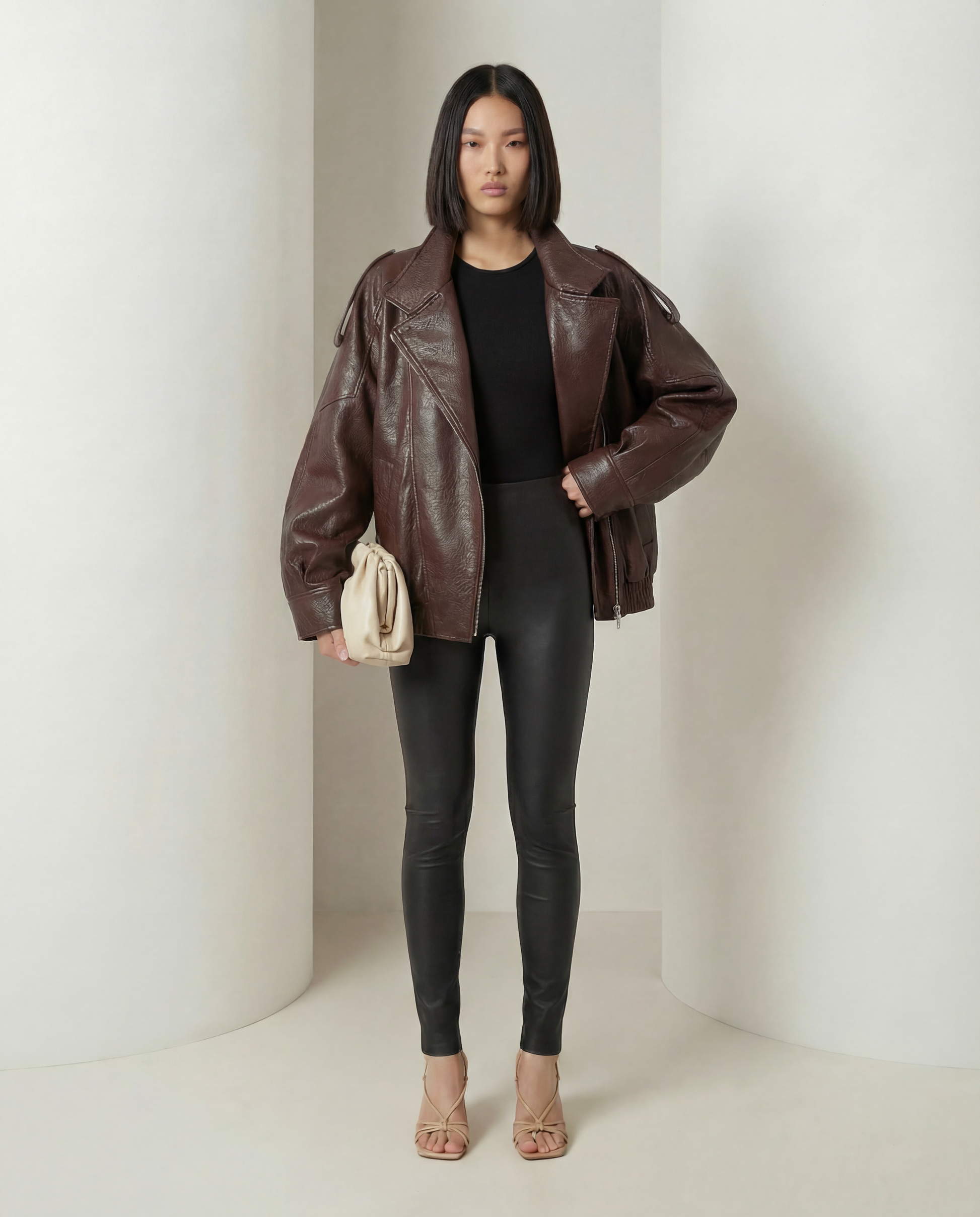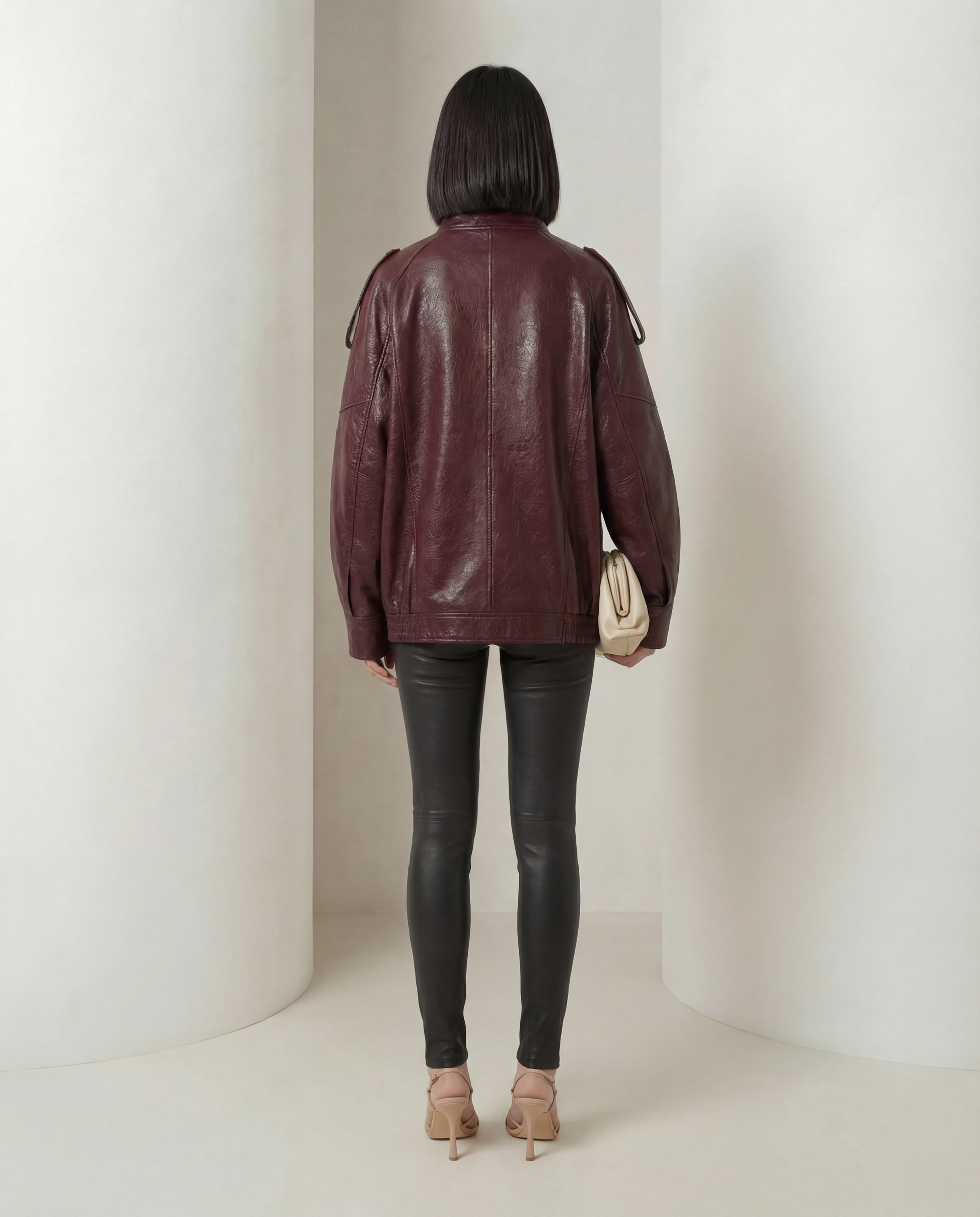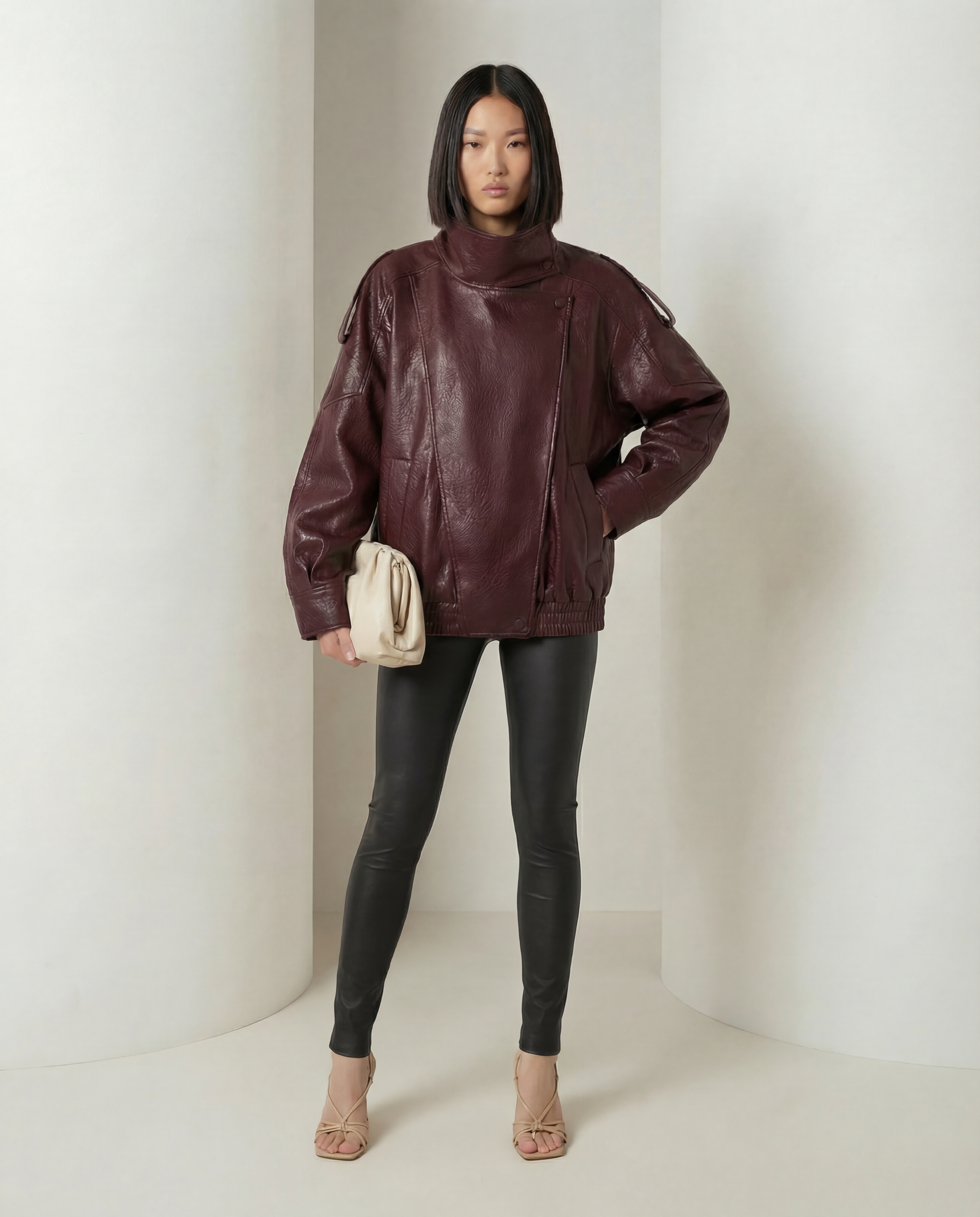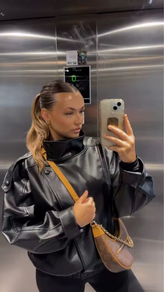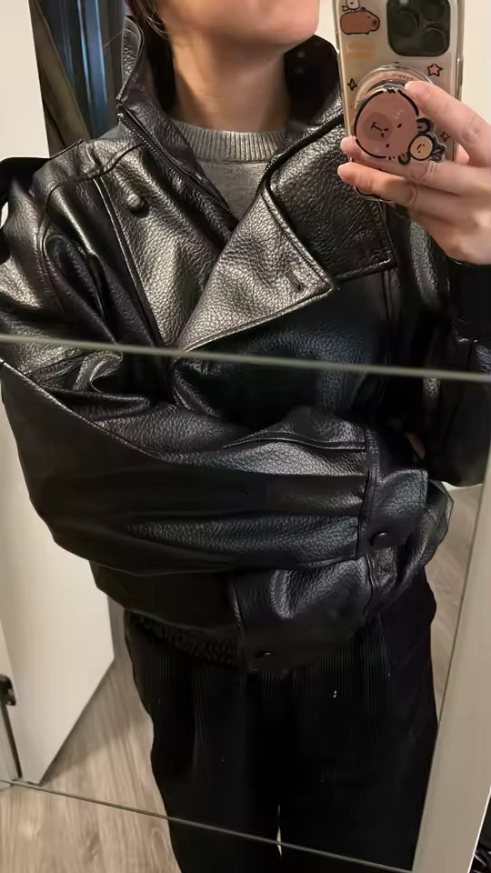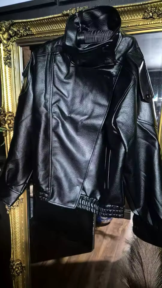 This piece features a softly oversized silhouette with dropped shoulders, elasticated hem, and a high stand collar for a modern, architectural finish. The smooth vintage-effect PU leather gives a polished look while remaining lightweight and easy to wear.