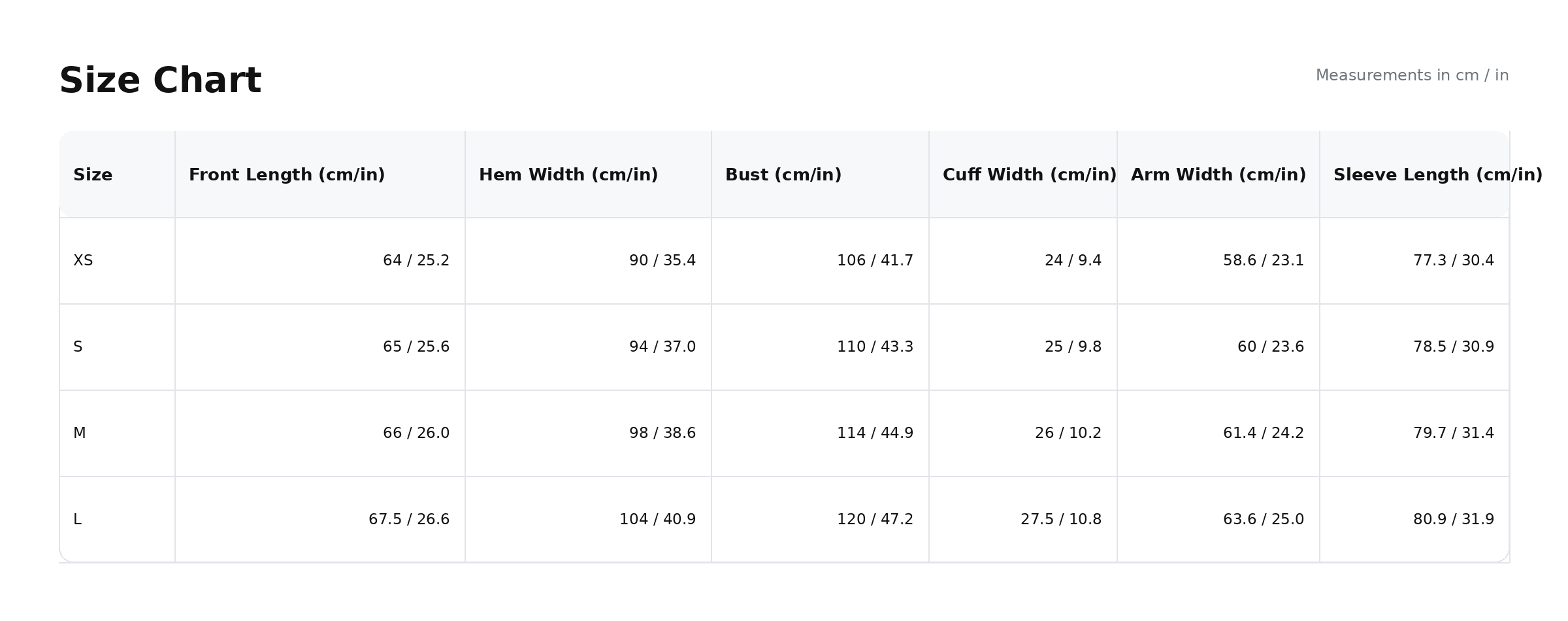 Size Guide (cm/in)
